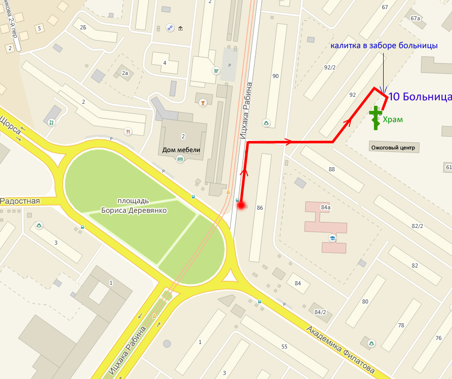 2. Маршрутка № 121, 175, трамвай № 10 до остановки ул. Маршала Малиновского, далее пешком до входа в больницу и по территории больницы до Ожогового центра.